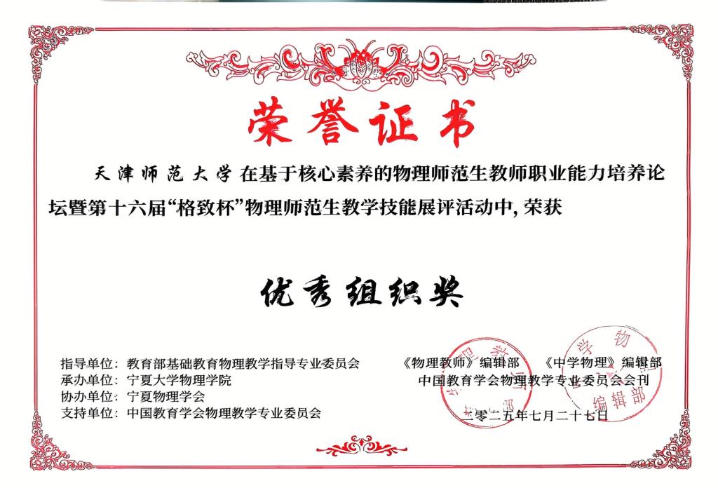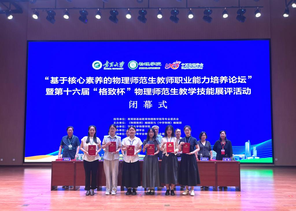 本站讯(通讯员郝健强 杨雪)7月25日至27日,基于核心素养的物理师范生教师职业能力培养论坛暨第十六届“格致杯”全国物理师范生教学技能展示与交流活动在宁夏大学举行。本次活动吸引全国百余所高校参与,beat365物理与材料科学学院师生表现突出,共斩获包括“优秀组织奖”在内的11项荣誉,其中温熙雅包揽教学技能展示、创新实验设计与自制教具双项一等奖,陈楷月、侯家瑞、于佳灵、张欣4位同学在两项赛事中均获二等奖。