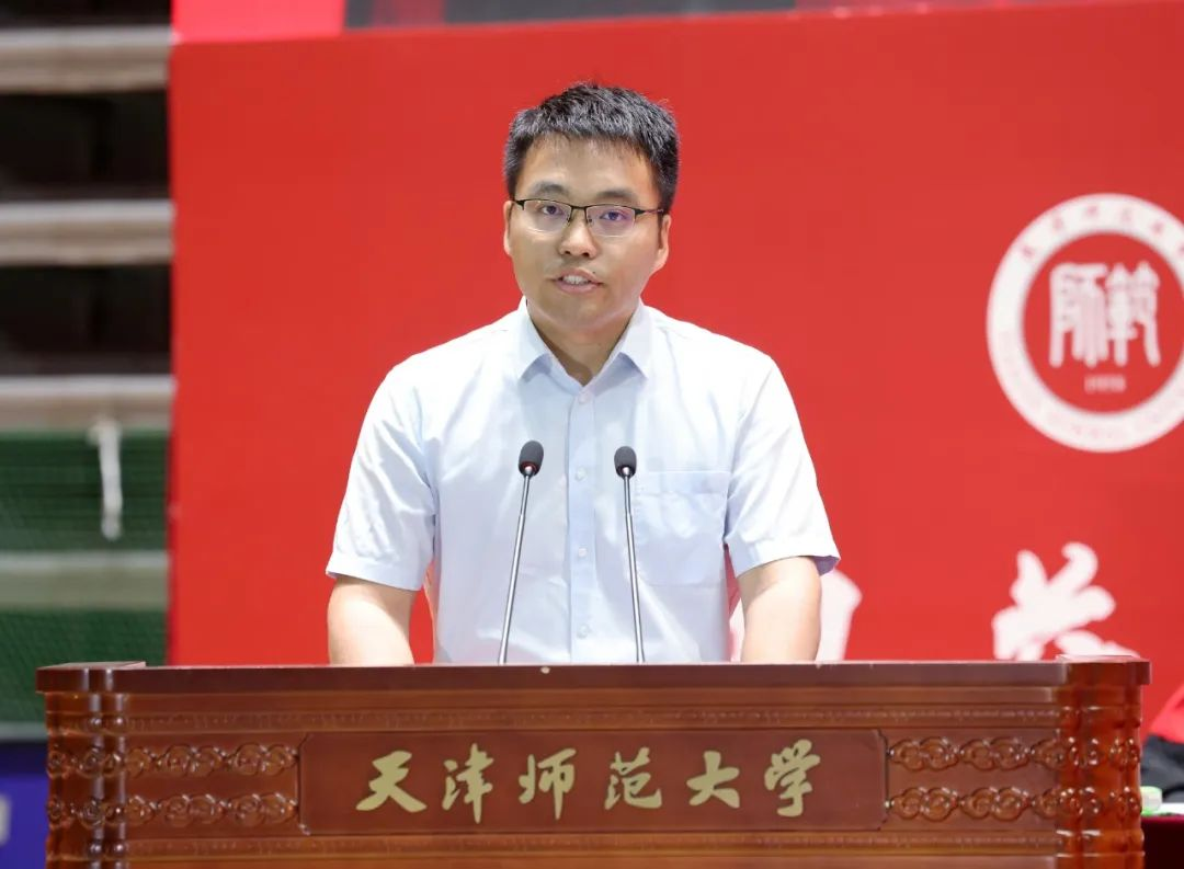 天津市特聘教授青年学者、化学学院王超作为教师代表发言。他结合个人学习、科研经历寄语广大毕业生,永葆求学求真的韧性,在科研探索中提升专业素养,在实践锻炼中涵养担当精神,培养面对挫折的能力,担起传播文明的责任,主动对接国家战略需求,在未来成长道路上以师大精神为激励,为中国式现代化建设贡献智慧和力量。