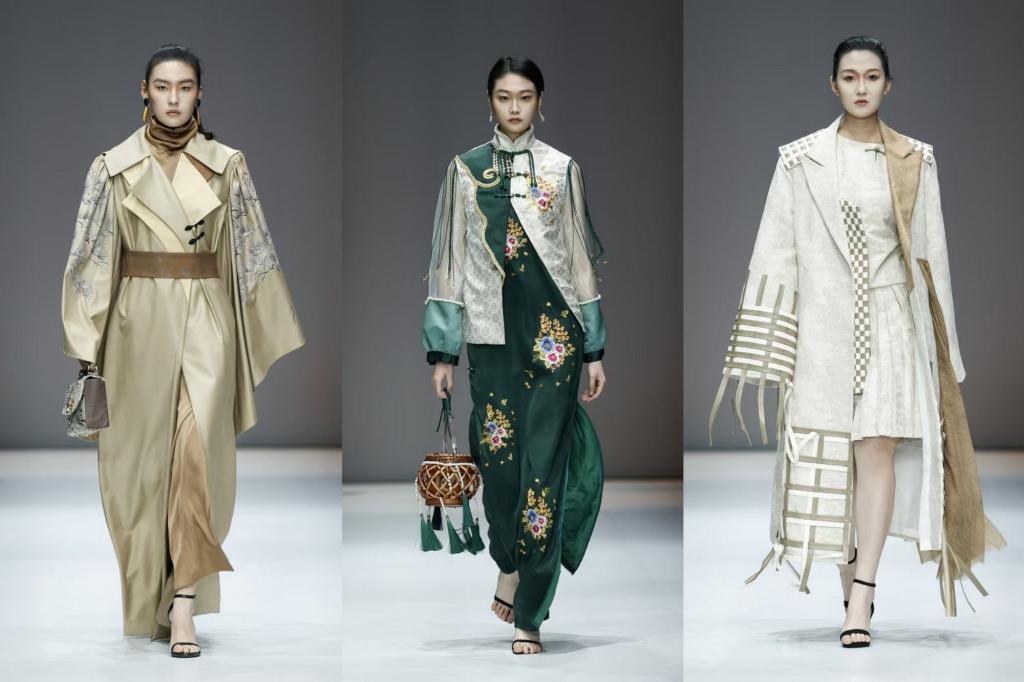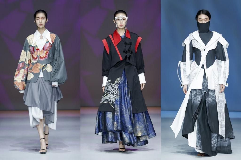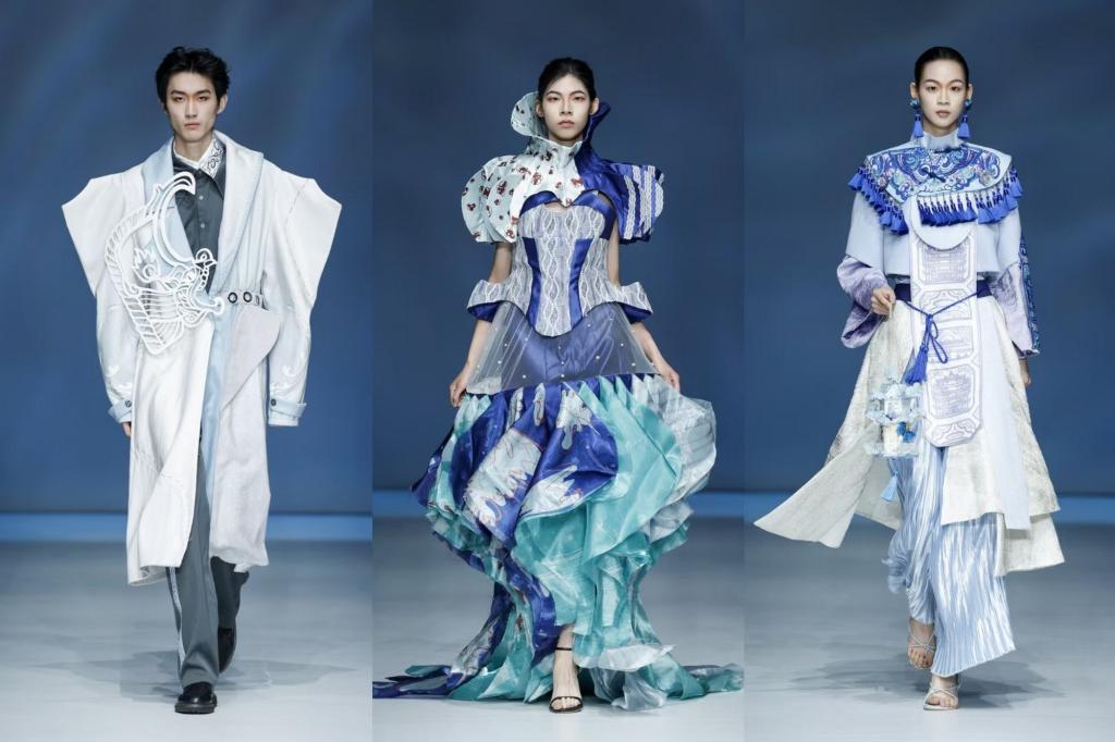在作品中,海河涟漪的动态线条化作流动的裙摆与褶皱,五大道洋楼的拱窗穹顶幻化为立体的剪裁结构,非遗文化的砖雕纹样、彩绘元素经数码印花、激光雕刻等现代工艺重新诠释,形成“历史与未来对话、东方与西方交融”的设计语境。例如,杨柳青年画的花鸟图式以渐变数码印花呈现于极简廓形的裙装,泥人张彩塑的圆润肌理通过3D打印技术转化为立体装饰;三岔河口的河道走势被抽象为服饰上的弧线剪裁,瓷房子的碎瓷拼贴肌理则以钉珠工艺与亮片绣制再现,让六百年城市记忆在经纬交织间焕发新生。