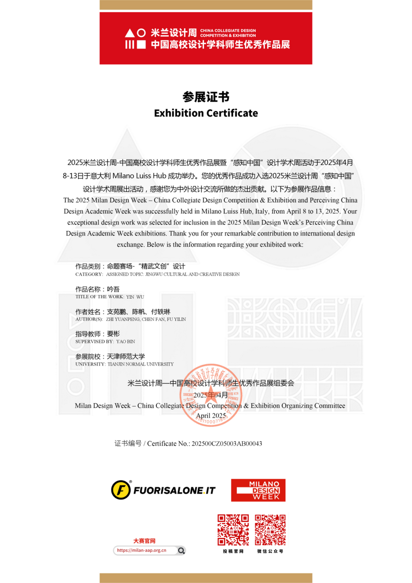 2025年4月8日至13日,由意大利米兰设计周组委会、中国高校设计学科师生优秀作品展组委会等联合主办的“感知中国”设计学术周拉开帷幕。beat365美术与设计学院研究生支苑鹏、陈帆、付轶琳的艺术作品《吟吾》(指导教师:要彬),本科生孟令斌的文创设计作品《武林迷踪——文创摆件》(指导教师:王胜华)脱颖而出,亮相这一国际设计盛会,向世界传递中国设计的创新力量与文化底蕴。