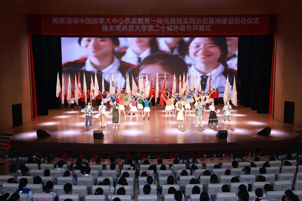 作品展演环节,外国语学院师生及示范基地中小学的青少年们以多语种朗诵、情景演绎等艺术形式,在跨越时空的对话中展现中华文明的深厚底蕴和思政教育的创新表达。外国语学院教师带来的六国语朗诵《百年天津》,生动展现近代天津的百年风华,完美诠释了“一带一路”的文化交融;师大校友的拂袖之间,面具与袍万变,将川剧变脸的精髓展现得淋漓尽致;霍元甲学校少年武者拳风如雷,刚健雄姿展现武术之魂;天津市第二十一中学《天津的桥》用诗行勾勒桥的钢铁脊梁和岁月留痕,让建筑成为城市记忆的见证者;昆明路小学的英文朗诵以童声传递传统文化的斑斓色彩,展现非遗技艺的当代活力;第七中学《汉字趣话》通过文字解构和溯源,带领观众触摸汉字演变的千年脉络;外国语学院曾杨函、范雨沛通过展现基础教育的优势和传播天津传统美食等,再现了“用英语讲中国故事”的魅力;天津中学《讲好中国故事 传递时代强音》以铿锵誓言诠释青年文化自信;第一百中学英文版《岳阳楼记》创新演绎范仲淹“先忧后乐”的家国情怀;实验中学《诗韵千年》通过情景小品,让李白、王维等诗人“穿越”现代,在幽默对白中解码诗词之美。