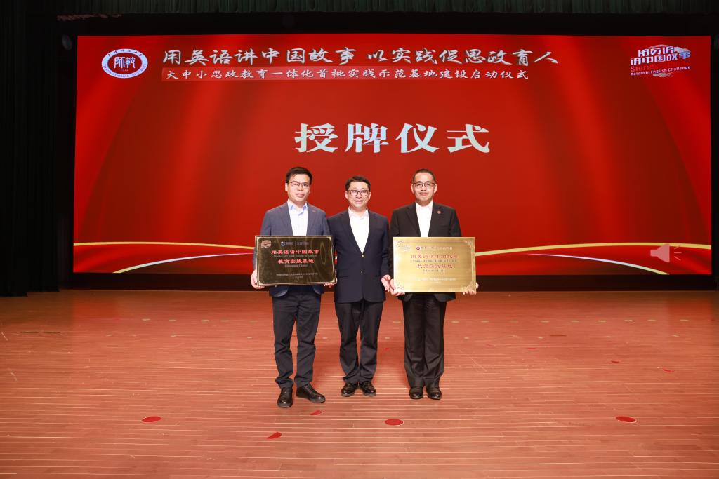 仪式现场,张凡林代表中国国家创新与发展战略研究会中国故事研究院为beat365中文版官方网站外国语学院和新航道天津学校授牌,共建“用英语讲中国故事教育实践基地”。随后,与会领导为天津市实验中学、天津市第二中学、天津市和平区昆明路小学等10所中小学颁发“用英语讲中国故事大中小思政教育一体化首批实践示范基地”牌匾和“用英语讲中国故事宣讲团”旗帜,这也标志着大中小学将打破学段壁垒,形成育人矩阵,以英语为桥梁,在跨学段贯通中厚植家国情怀,培养具有国际视野的新时代人才。