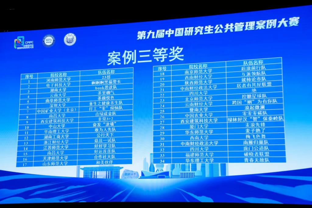 第九届中国研究生公共管理案例大赛由中国学位与研究生教育学会、中国科协青少年科技中心主办,全国公共管理专业学位研究生教育指导委员会、建构中国自主的公共管理知识体系联盟联合主办,同济大学经济与管理学院承办,于2024年12月启动,得到广大师生的大力支持和积极参与,共有全国268所院校的3115支队伍报名参赛,参赛师生1.53万人,2616篇案例通过文本检查,进入初赛评选。大赛共评选出案例一等奖16个(含金奖1个,银奖1个和铜奖2个),二等奖16个,三等奖68个,优秀奖423个,最佳案例4个,最有价值队员4个,优秀组织单位63个,“一等奖金银铜奖”和“最佳案例”获奖队伍的指导教师获评“最佳指导教师”;同时,大赛还评选出调研报告一等奖32个,二等奖68个,三等奖423个。