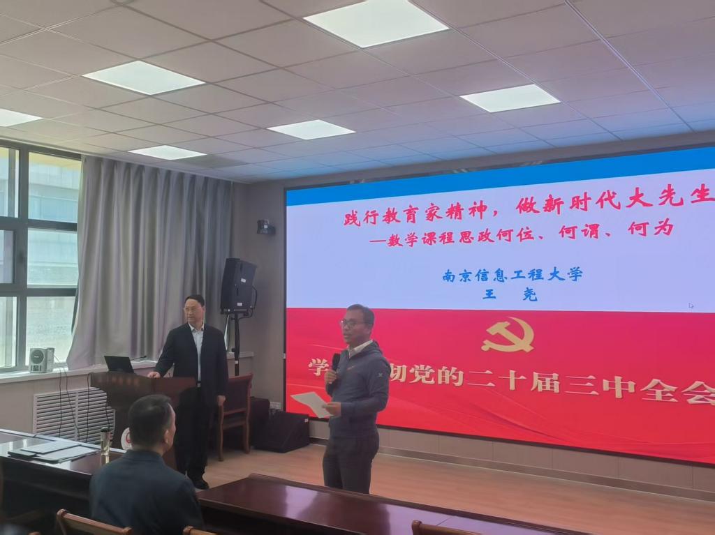 本站讯(通讯员 上官萌萌)为落实学校第九次党代会精神,加快教育强国建设,弘扬教育家精神,近日,南京信息工程大学博士生导师王尧教授应邀到数学科学学院就数学课程如何开展课程思政进行专题指导,并以《弘扬教育家精神,做新时代大先生——数学课程思政何位、何谓、何为》为题作报告。数学科学学院院长常慧宾研究员主持报告,学院教师、师范生代表参加。报告前,校党委常委、副校长秦龙会见了王尧教授。