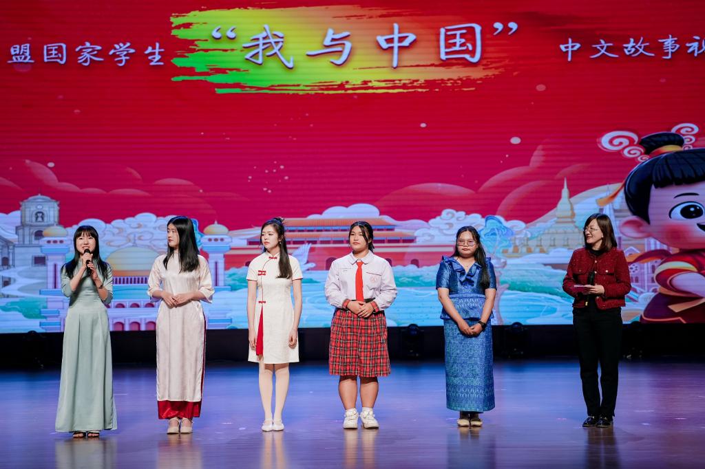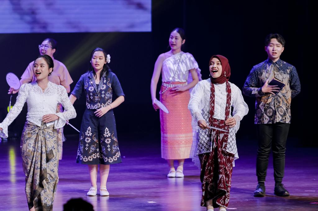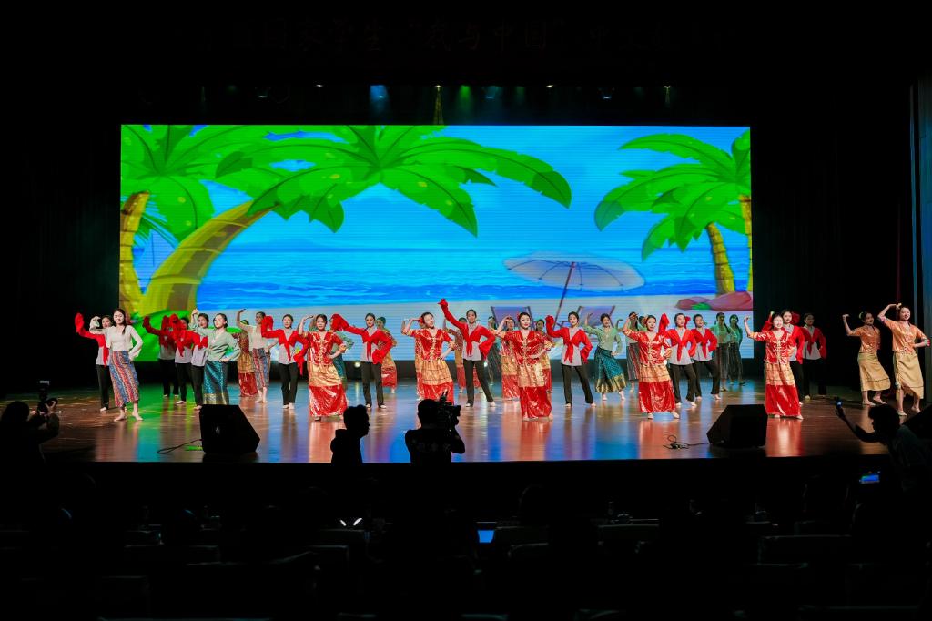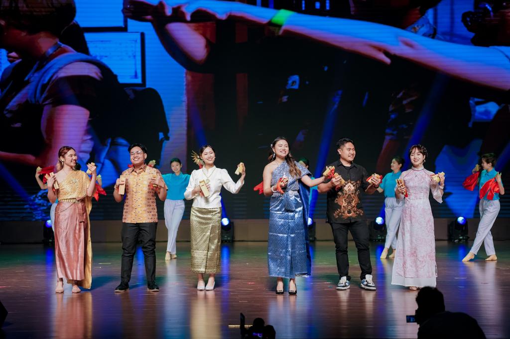 与会嘉宾共同观看京津冀学生展演作品,展演在彰显东盟风情的民族舞蹈串烧《多姿》中拉开序幕,原创音乐快板作品《“我与中国”情意长》展现东盟学子中文水平和精湛才艺的同时,流露出一种深厚的情怀和热爱;海外组织方以及选手采访VCR“中文改变了我”中选手们的真情流露感人至深,诠释了“语言是文化交流钥匙”的真正含义;北京高校展演作品《你好北外——青春之舞》在讲述青春风采和中国故事的同时,点燃了青春跃动、共赴新程的理想火焰;舞台剧《穿越奇遇》完美演绎了古代与现代因文化传承创新发展而碰撞出的别样火花;河北省高校选送节目《诗经东南风》中,东盟青年用东南亚歌曲唱诵诗经,播撒语言互通、理解互信、文明互鉴的种子;在“我与中国”非遗市集游园会中,天津高校东盟学生选手将文化市集搬到舞台,为现场观众送上新颖独特的文化创意和实践体验;AI创意对话展示《魅力中文》在展示科学创新发展的同时,抒发了希望科技之光引领国际中文教育走向更美好未来的愿望。