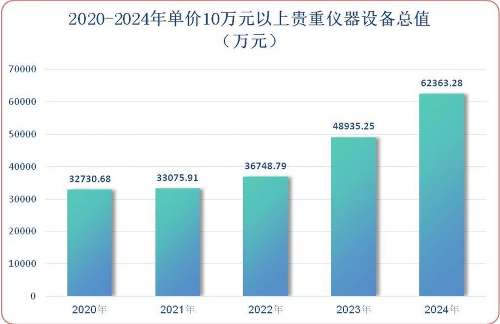 五年间,beat365资产总量迅速增加,资产结构更为合理,办学条件得到显著改善。2020年,beat365仪器设备总值为77793.74万元,到2024年末已达到123343.09万元,仅2022年中长期贷款采购教学科研仪器设备家具53861.10万元,其中,贵重仪器设备248台件,合同金额21323.85万元。近五年仪器设备总值增长58.55%。单价10万元以上贵重仪器设备总值由2020年的32730.68万元增长至62363.28万元,近五年总值增长90.53%。