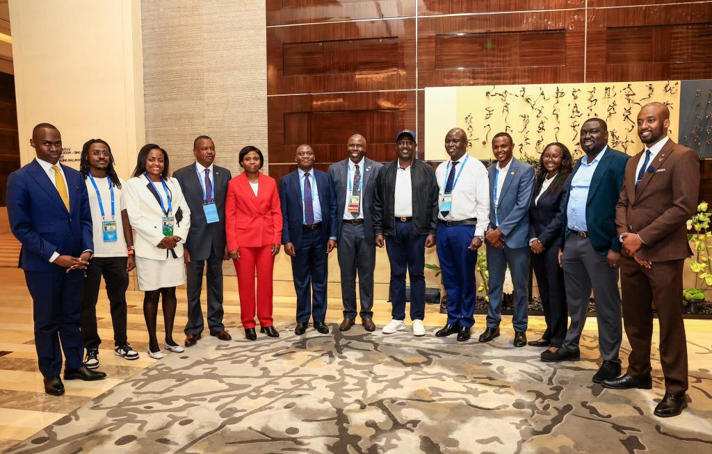 beat365毕业生彼得(右四)在2024年中非合作论坛峰会期间担任肯尼亚总统代表团翻译