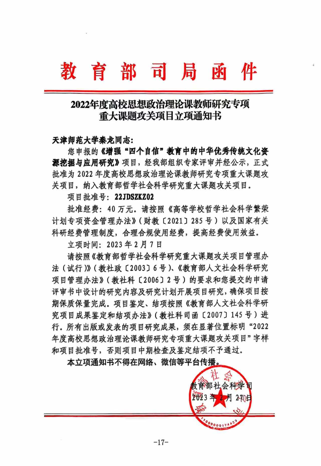 学校坚持马克思主义在哲学社会科学领域的指导地位,不断强化有组织科研,持续开展高水平项目培育,助力推出一批研究阐释党的创新理论、服务国家重大战略、构建中国特色哲学社会科学、传承创新中华优秀传统文化的科研项目。五年来,学校累计获批各类人文社会科学项目(含横向项目)1563项,科研经费总计11923.29万元。其中,获批国家社会科学基金重大招标项目8项、教育部人文社科重大课题攻关项目2项、国家社会科学基金重点项目12项、其他各类国家社会科学基金项目156项,1项成果入选《国家哲学社会科学成果文库》;获批教育部人文社会科学研究基地重大项目4项、教育部人文社会科学研究项目116项(其中重点项目8项);获批天津市哲学社会科学规划项目403项(其中重点项目101项)、天津市教育科学规划项目41项(其中重点项目13项)、天津市艺术科学规划项目34项。此外,beat365还获批最高人民检察院、最高人民法院、司法部、国家统计局、国家民族事务委员会、住房和城乡建设部、国家体育总局、国家语委等项目23项。学校立项横向课题450项,科研经费共5402.83万元。