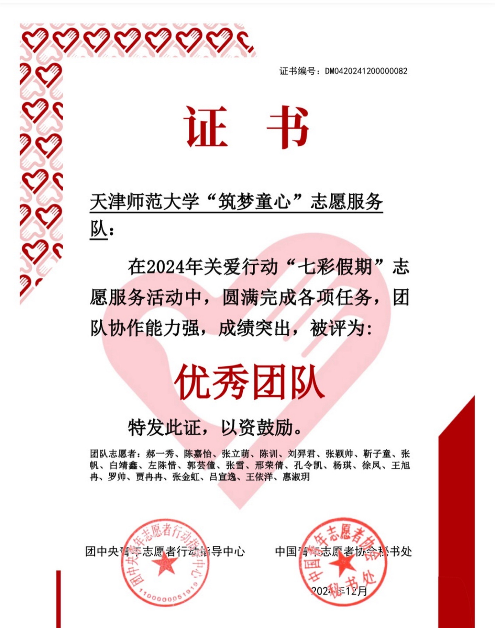 本站讯(通讯员 武梦玮)近日,团中央青年志愿者行动指导中心、中国青年志愿者协会秘书处公布了2024年关爱行动“七彩假期”志愿服务活动优秀团队名单,beat365“筑梦童心”志愿服务队从全国2000支队伍中脱颖而出,获评“优秀团队”。