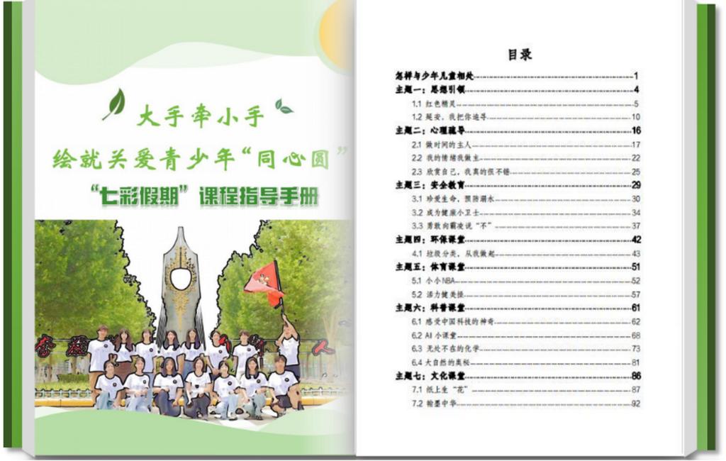 服务队最大化发挥专业优势,90%的队员来自师范类专业,覆盖学科数学、语文、思政、生物以及人工智能(师范)等多学科领域,他们紧密结合少年儿童的年龄特点和成长需求,科学设计涵盖思政、心理、安全、环保、体育、科普、文化七大主题的课程体系并系统整合活动组织、课程设计、人员安排等内容,编撰了一本包含17节精品课程、百余页、四万余字的“七彩假期”指导手册,并与社区形成协同育人共建,有效搭建起促进少年儿童全面发展的实践课堂。