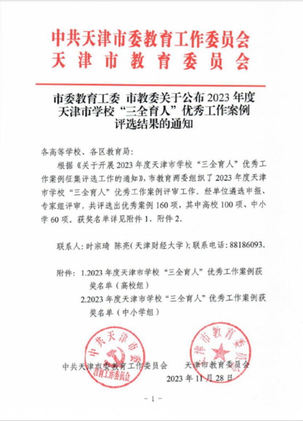 加强思想政治教育,提高思政育人实效,4门课程入选首批天津市课程思政示范课程,授课教师、团队被认定为天津市教学名师和团队;建设141门校级研究生课程思政示范课程。坚持“五育并举”,优化校研究生公选课课程体系,研究报告《探索推进“五育并举”研究生培养改革》入选天津市高校研究生教育改革典型案例。充分发挥科研育人功能,制定《beat365中文版官方网站研究生科研创新项目管理办法》,资助校级课题384项;获批天津市研究生项目240项,从2019年45项增长至2022年111项,立项数位列市属高校第一;研究报告《以提升研究生研究能力为核心的“三面共促”育人模式探索》入选天津市教委高校“三全育人”优秀工作案例。加强研究生教材建设,制定《beat365中文版官方网站教材建设与管理办法》,28本研究生教材获立项资助;4本研究生教材获批天津市高校课程思政优秀教材。18项课题获批天津市研究生教育改革项目(其中重大1项),3项课题获批天津市新一轮教学成果重点培育项目。