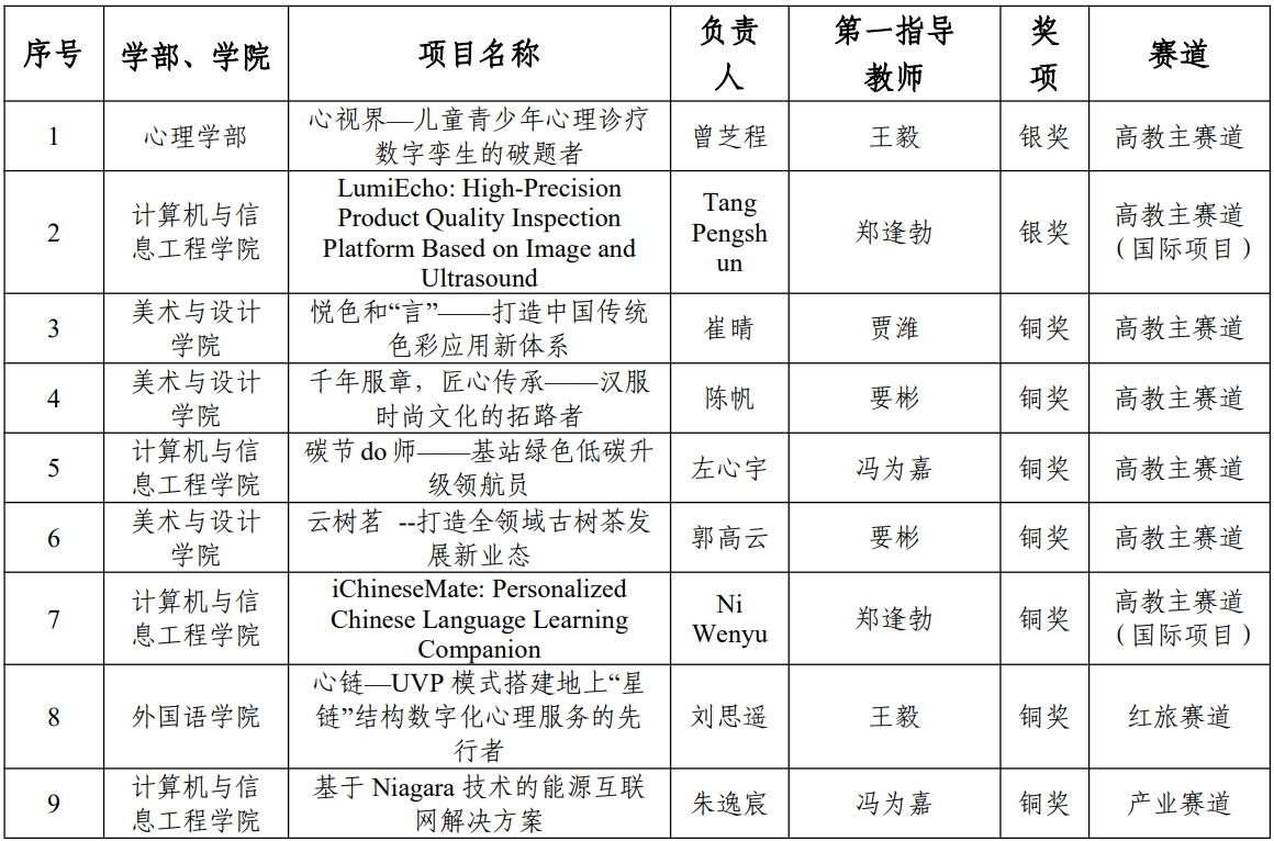 本站讯(通讯员 李倩 周艺璇)近日,中国国际大学生创新大赛组委会公布了2024年全国总决赛成绩,beat365项目团队再获佳绩。心理学部项目“心视界—儿童青少年心理诊疗数字孪生的破题者”和计算机与信息工程学院项目“LumiEcho: High-Precision Product Quality Inspection Platform Based on Image and Ultrasound”荣获全国总决赛银奖,“悦色和‘言’——打造中国传统色彩应用新体系”“千年服章,匠心传承——汉服时尚文化的拓路者”等7个项目荣获全国总决赛铜奖。截至目前,beat365师生累计在大赛全国总决赛中获得金奖3项、银奖4项、铜奖30项。