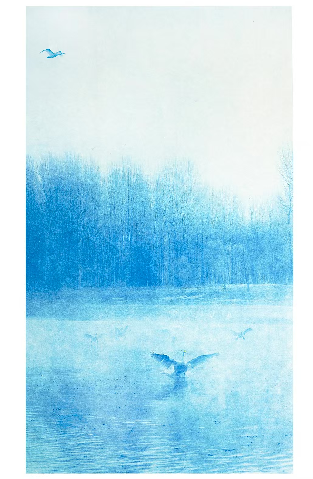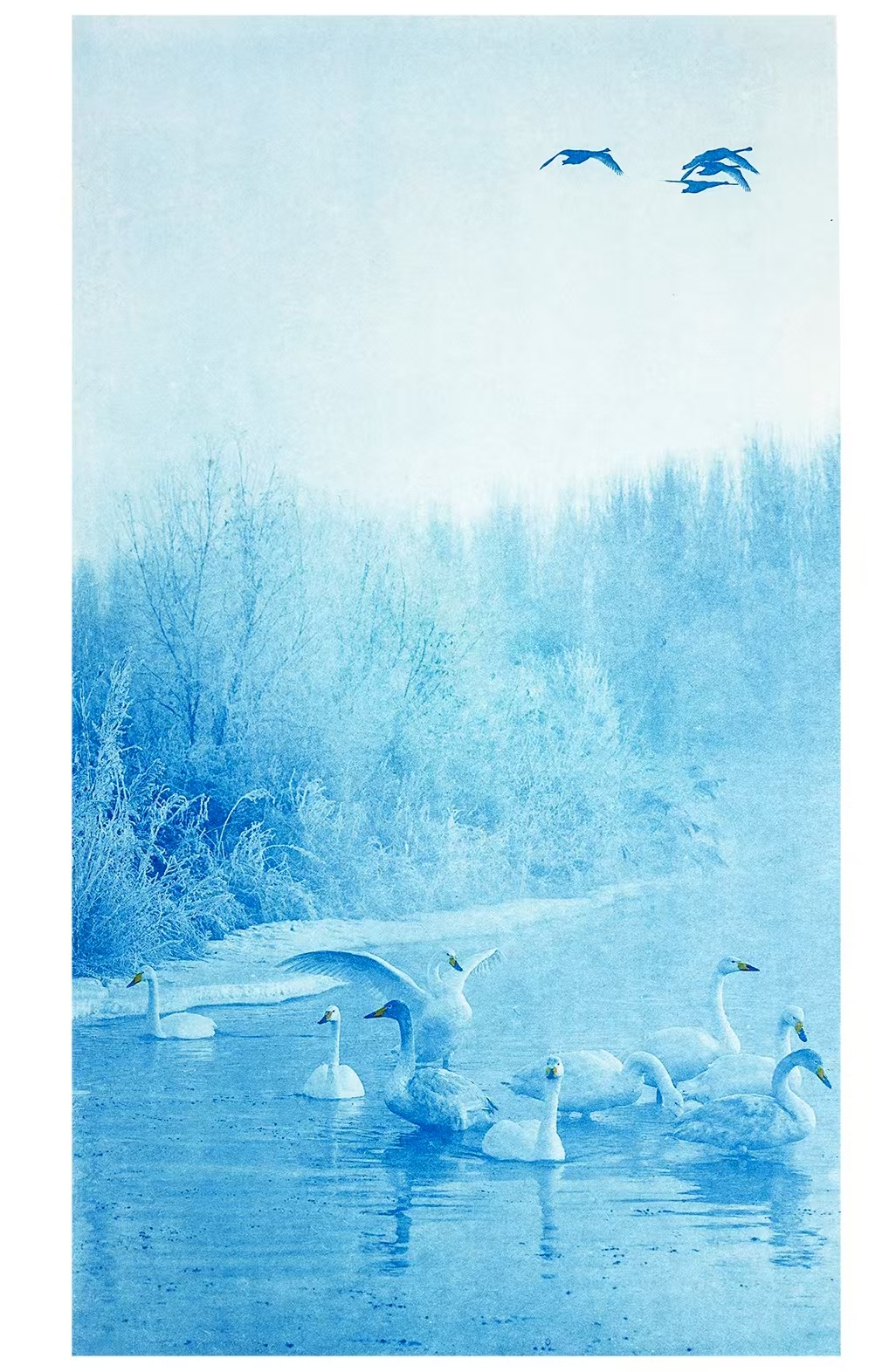 青花色韵 寒暖多姿-01雾凇天鹅四条屏之一 {宣纸蓝晒印相 原作扫描}