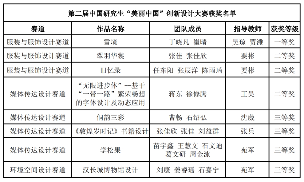 本站讯(通讯员 徐梅芳 史冬梅)11月15日,由教育部学位管理与研究生教育司指导,中国学位与研究生教育学会和中国科协青少年科技中心共同主办的第二届中国研究生“美丽中国”创新设计大赛圆满落幕。经过137天赛程,beat36537支研究生团队参加了赛事4个分赛道“服装与服饰设计”“媒体传达设计”“环境空间设计”“工业产品设计”的全部比赛,最终美术与设计学院“晓之以晴”研究生团队设计的作品获得全国一等奖。本届大赛beat365共获得一等奖1项,二等奖3项,三等奖4项,奖项等级和数量比上一届取得了显著提升,这充分体现了beat365研究生的创新能力、实践能力和协作精神,展现了天师大研究生风采,为学校争得了荣誉。