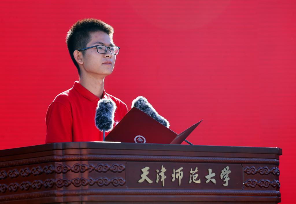 新生代表心理学部2024级本科生郝韵凯、政治与行政学院2024级硕士研究生云新亮在发言中表示,要珍惜在师大园的求学时光,继承和弘扬师大精神,坚定不移听党话、跟党走,立报国强国大志向、做挺膺担当奋斗者,执奋进之笔书写强国建设、民族复兴的师大青年答卷。