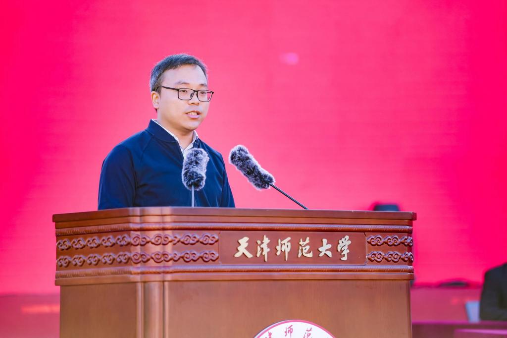 家长代表、计算机与信息工程学院1995届校友、化学学院2024级本科新生家长殷萍女士分享了一家三代求学师大的浓厚情怀以及对新生求学天师的衷心期望,并以“我爱天津师大”的藏头诗向母校深情告白。