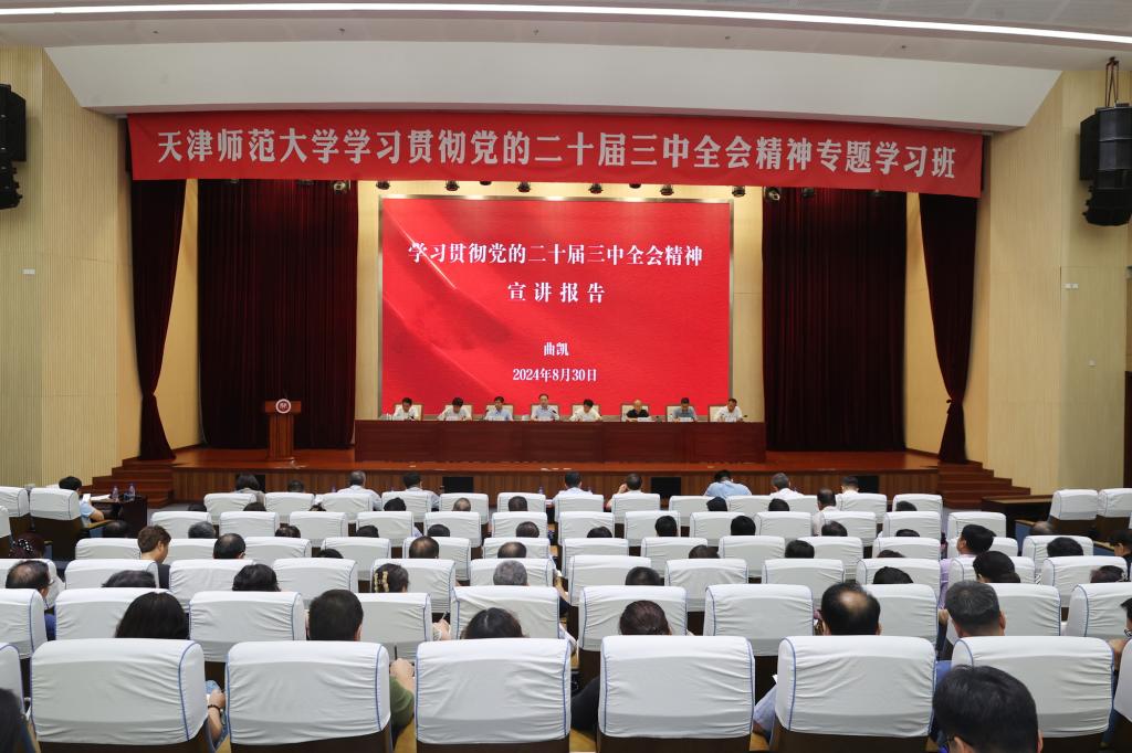 党委宣传部消息 8月30日下午,在天津师大学习贯彻党的二十届三中全会精神专题学习班上,校党委书记曲凯围绕学习贯彻党的二十届三中全会精神开展专题宣讲,对全校上下进一步凝聚共识、坚定信心,抢抓机遇、开拓进取,全力贯彻落实全会精神提出要求。校领导班子成员出席,全校处级及以上领导干部和党支部书记参加学习。会议由校党委副书记陈泮成主持。