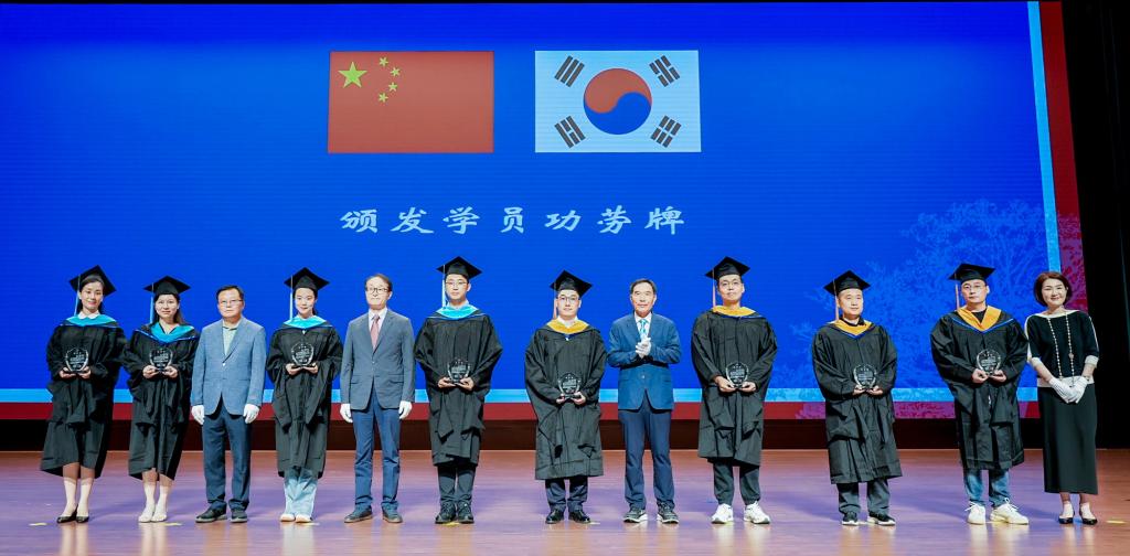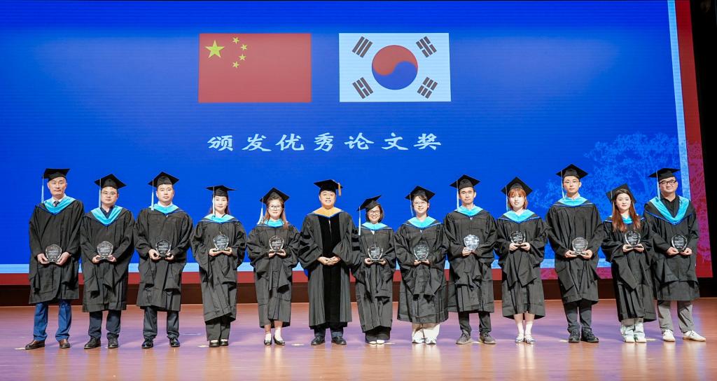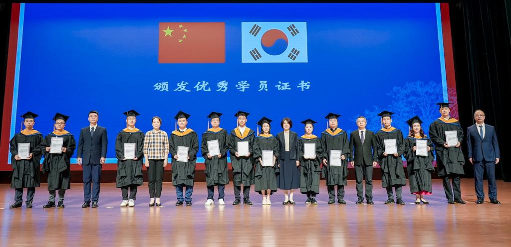 杨薇作本届中韩合作办学项目硕士研究生培养过程报告。中韩双方相关部门负责人向双方教学和管理人员、优秀学员等颁发优秀论文证书和优秀学员证书。