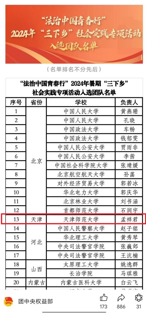 教育学部消息(通讯员 王立冬 张丽姣)近日,共青团中央维护青少年权益部、司法部普法与依法治理局、公安部禁毒局联合指导开展“法治中国青春行”2024年全国大学生“三下乡”暑期社会实践专项活动。来自全国的2204支团队报名参加,经专家审议遴选出108支团队,beat365教育学部“津法育童心”基层普法团作为天津地区唯一一支团队入选。