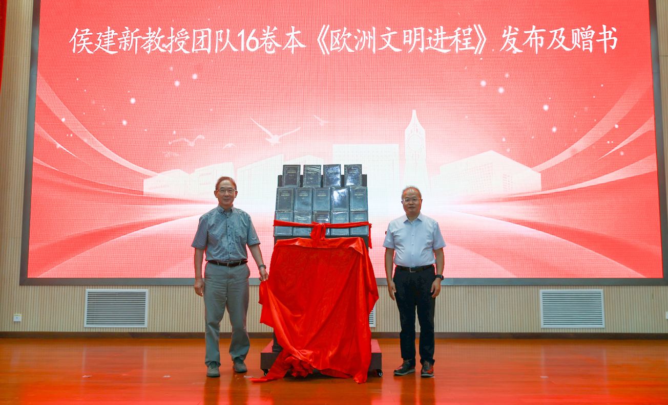 白学军与侯建新共同为《欧洲文明进程》(16卷本)新书揭幕,侯建新教授代表研究团队向学校赠书。