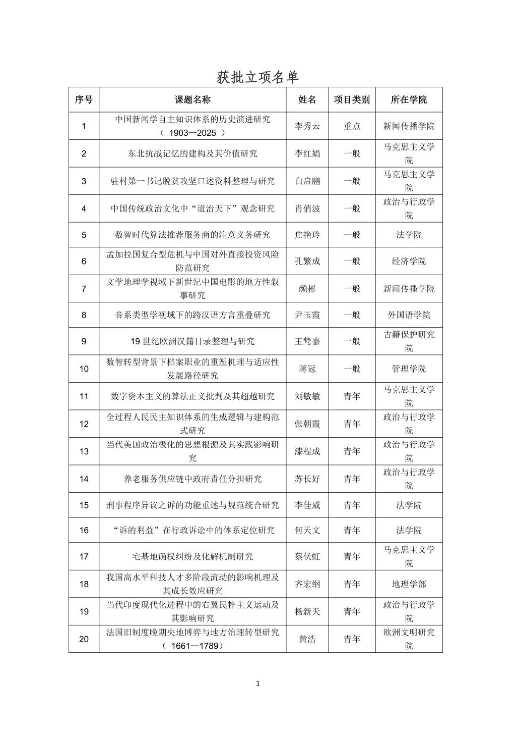 在26项国家社科基金年度项目中,政治与行政学院获批5项,马克思主义学院获批4项,管理学院和法学院分别获批3项,新闻传播学院、外国语学院、古籍保护研究院分别获批2项,心理学部、文学院、欧洲文明研究院、经济学院、地理学部分别获批1项。