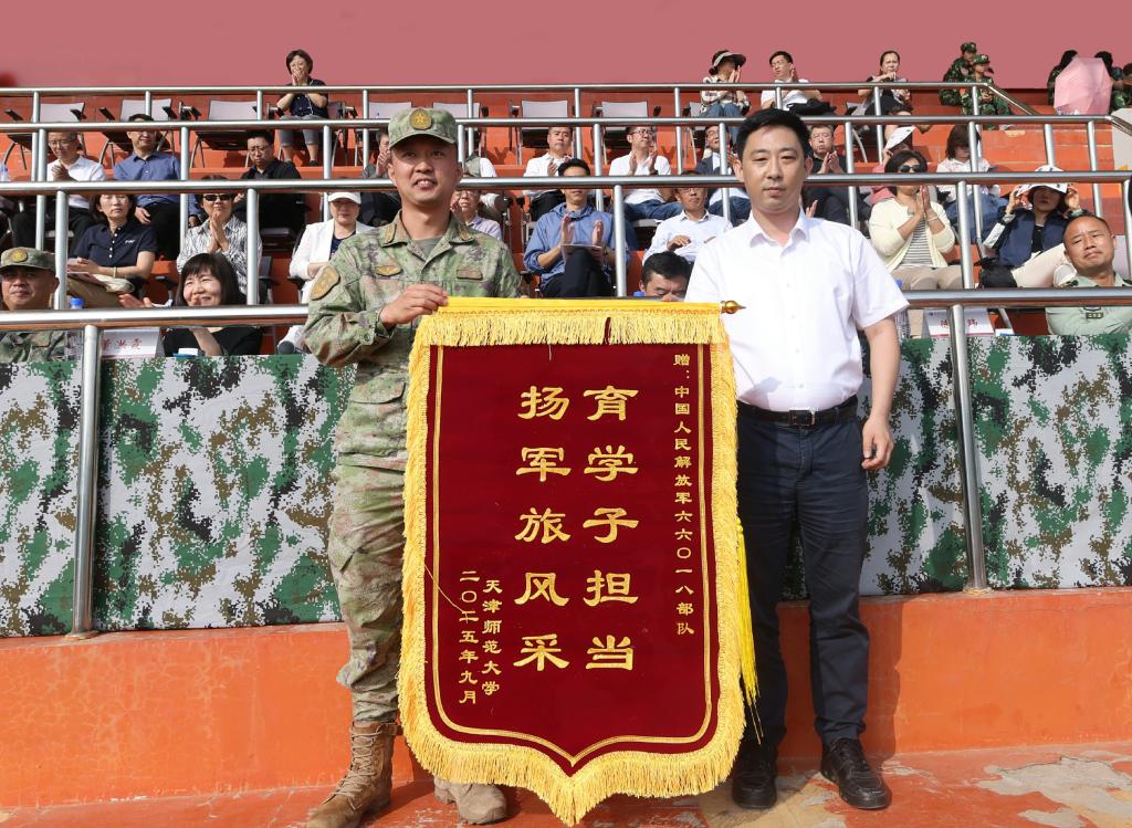 汇报结束后,陈玳玮向承训部队赠送锦旗,对部队官兵的辛勤付出表示感谢。参会领导和来宾为“爱我中华 情系国防”学生军训歌咏比赛、内务整理标兵宿舍比赛获奖单位颁奖。