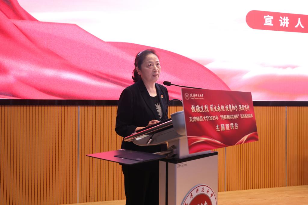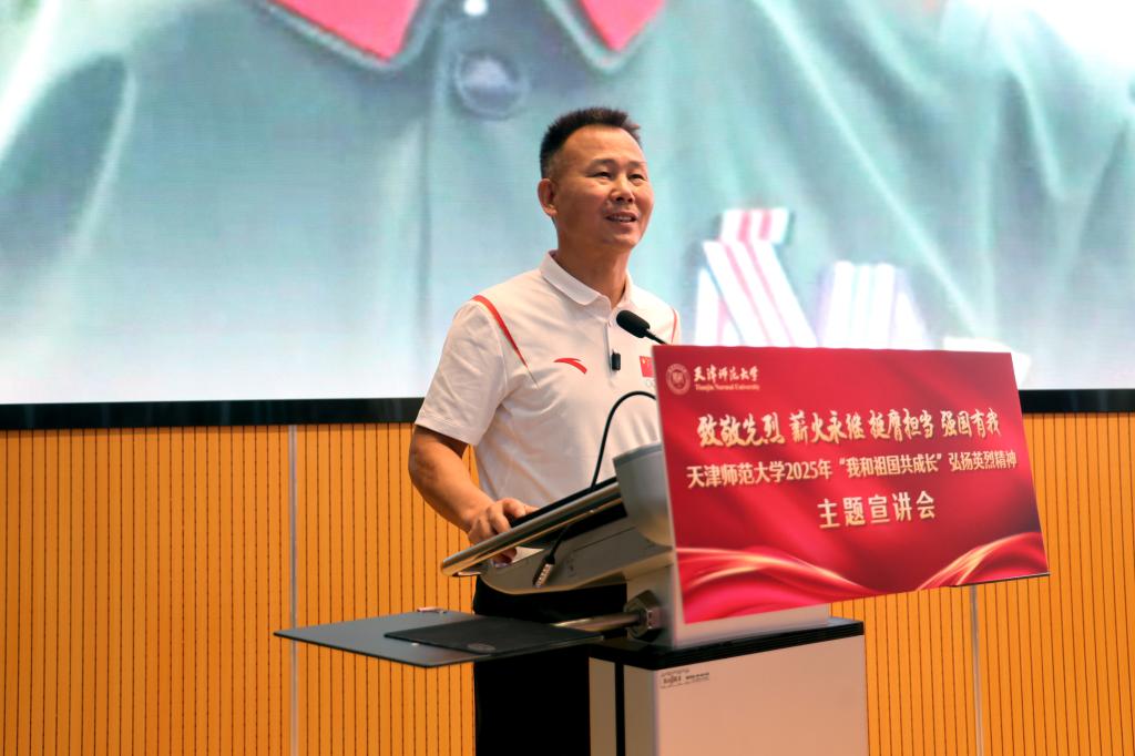董洪霞代表学校对宣讲团各位英模代表的到来表示热烈欢迎和衷心感谢。她指出,作为天津百年师范教育的传承者,天津基础教育文脉发祥地,beat365中文版官方网站始终与民族同命运、与祖国共奋进,秉承“为党育人、为国育才”初心,将红色血脉融入教书育人全过程。她深情寄语全体师大学子要铸牢理想信念,做红色基因的坚定传承者,坚定不移听党话、跟党走,在面对各种思潮冲击时,能够保持定力、明辨是非、坚守初心,以青春“小我”之进服务祖国“大我”之强;要厚植家国情怀,做强国征程的奋勇开拓者,常怀“国之所需,我之所向”的使命感,在面对各种困难和挑战时,要以国家和民族的利益为重,在科技创新、乡村振兴、绿色发展、社会服务、卫国戍边等各领域各方面勇担使命;要练就过硬本领,做民族复兴的接棒奋斗者,到祖国和人民最需要的地方发光发热,为中国式现代化建设贡献青春力量!