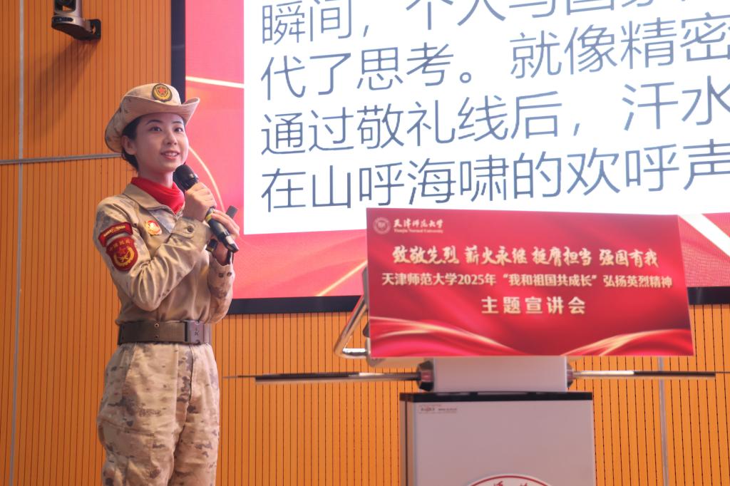 宣讲会邀请弘扬英烈精神宣讲团专家、成员,天津市关工委德育部部长、吉鸿昌烈士外孙女郑吉安,对越自卫反击战战士谢绍云、孙长亭,“九三阅兵”民兵代表王米佳以亲历者“第一视角”的动情讲述,再现烽火峥嵘与阅兵盛况,弘扬伟大抗战精神,激扬爱国赤子情怀,为现场师生带来一堂最厚重、最鲜活、也最震撼人心的“大思政课”。