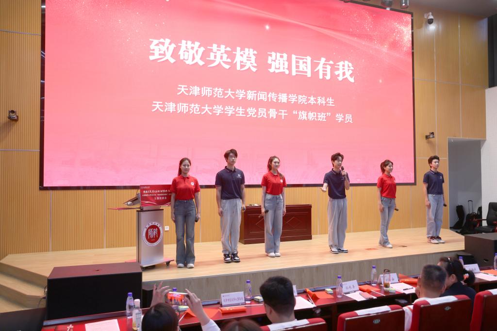 “致敬先烈 薪火永继 挺膺担当 强国有我!”新闻传播学院本科生代表以铿锵有力的青春宣言向英模致敬,向祖国深情告白。学生党员骨干“旗帜班”学员满怀崇敬向英模代表献花。