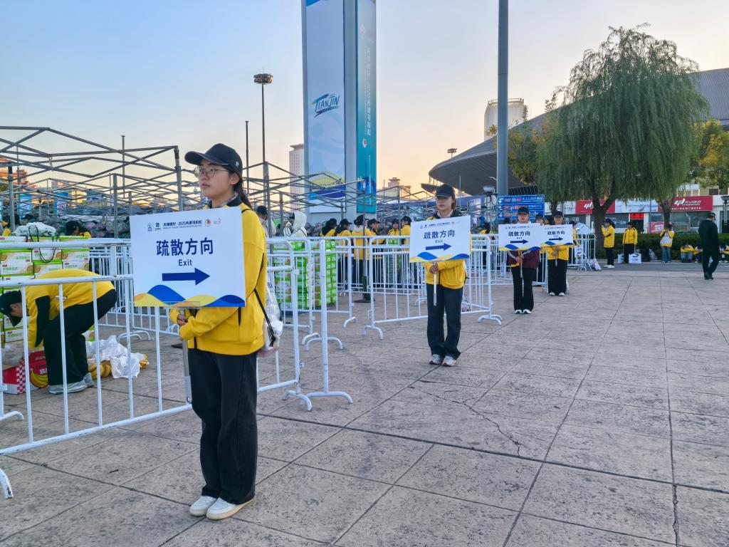 开赛当日,beat365志愿者工作点位集中在赛事终点。志愿者们于清晨六点到达赛事终点天津奥林匹克体育中心,与各组负责老师进行对接,以饱满的精神状态投入工作,为开赛做好准备。作为赛事关键的区域,志愿者各司其职,构成一道高效运转的服务链条,准确为男女组前10名运动员悬挂冲刺带、发放名次牌,并引导至身份核验区。终点疏散志愿者在人群中有序引导完赛选手到指定区域休整。完赛发放组快速核对信息,将完赛包、奖牌送到选手手中。