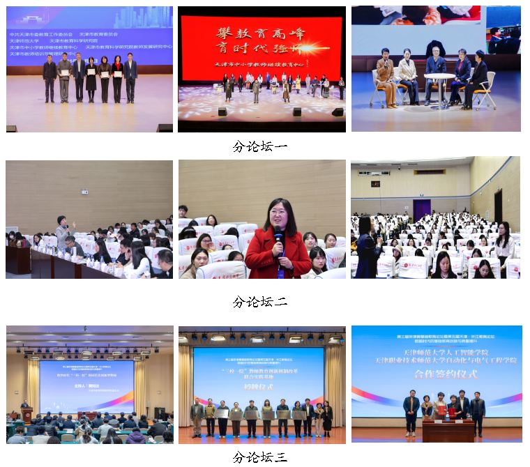 在分论坛环节,分论坛一以“数智时代的基础教育教师队伍建设”为主题,通过专家报告、教师教育培训规划汇报、教师培训重点项目结业活动等形式,展现了师资队伍分层分类进阶式培养取得的显著成效。分论坛二以“数智时代的基础教育课程教学变革”为主题,专家报告精准回应了数智时代课程教学变革的核心关切,通过理论思辨与实践案例的碰撞,为构建兼具数字智慧与人文关怀的未来教育图景描绘了清晰的实践路径,为区域教育协同发展提供了学理支撑。分论坛三以“数智时代‘三校一院’协同培养创新型教师”为主题,开展了专家报告、beat365中文版官方网站与天津职业技术师范大学相关学院签约仪式、“三校一院”联合实践基地授牌仪式等活动,推动协同育人机制走向实体化、机制化。