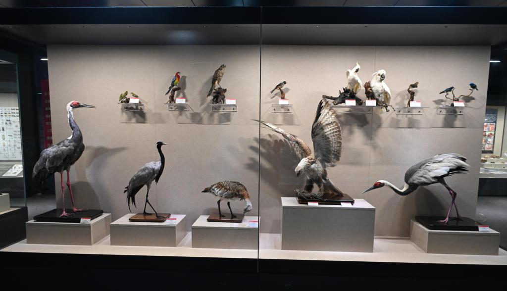 展馆分区科学合理,功能互补,为不同受众提供深度的学习与体验环境。展览区以生物标本陈列与数字化交互模式展出有国家一级保护动物麋鹿、东方白鹳、白枕鹤等。科普教室配备专业音响设备与高清投影系统,可容纳百余人,可开展学术讲座、科普宣讲与专题研讨等活动。实践体验区配备各类显微镜、超净工作台及恒温培养箱等实验设备,可支持动植物标本制作、组织培养、微生物培养、基因克隆等实验实践活动。活体饲育区养殖保育30余种动物,包括昆虫、蜘蛛、甲壳类、鱼类、两爬类、鸟类和哺乳类等观赏动物,通过与活体动物的互动,进一步提升科普教育的感染力与实效性。文创区将生物学元素,如动植物形态、细胞结构、DNA序列、微生物图案、羽毛等与文化艺术设计相结合,开发了兼具科普价值、艺术美感和商业价值的点翠、螺钿、胸针、水墨蝶羽等创意产品。