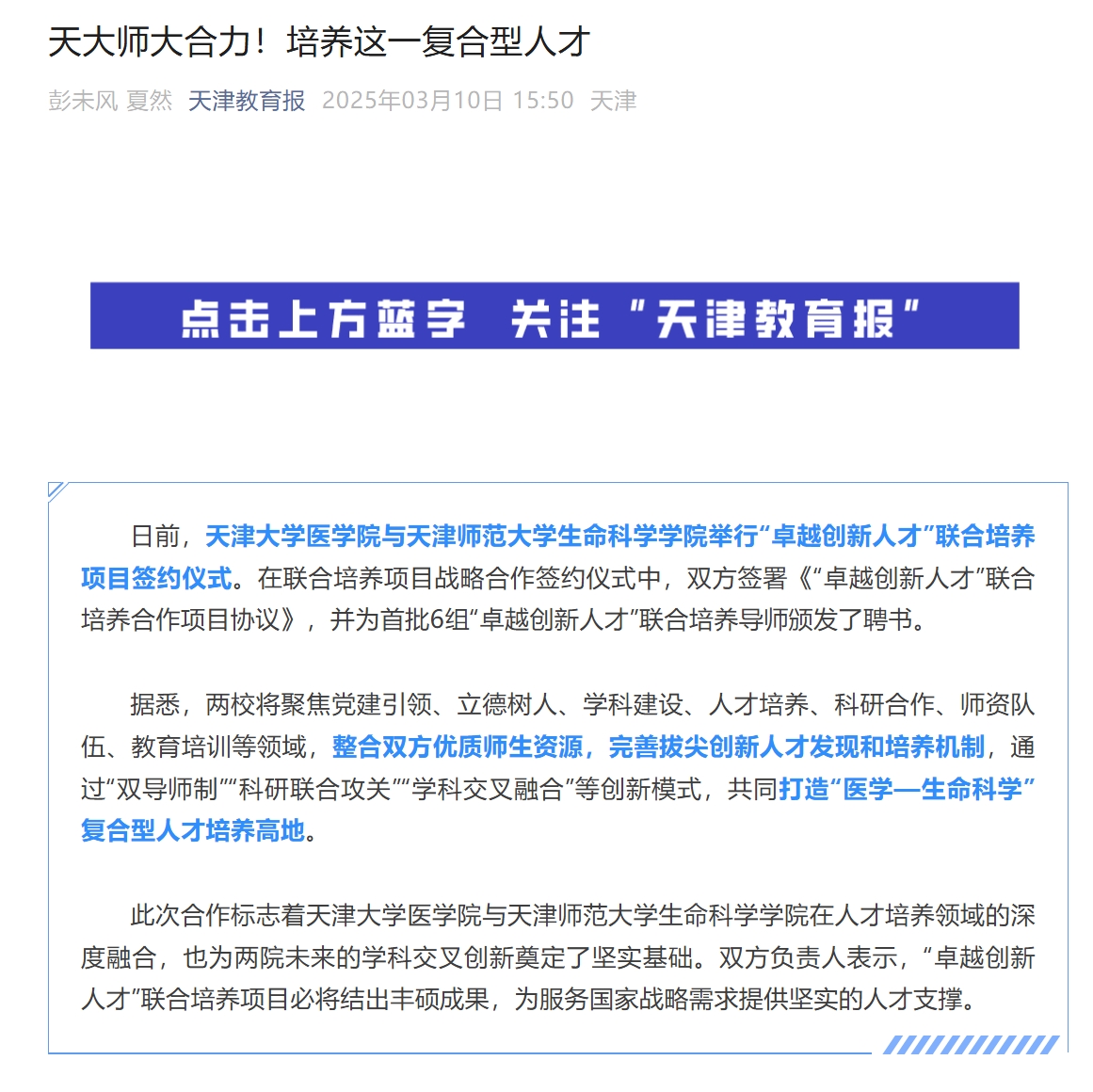 此次合作标志着天津大学医学院与beat365中文版官方网站生命科学学院在人才培养领域的深度融合,也为两院未来的学科交叉创新奠定了坚实基础。双方负责人表示,“卓越创新人才”联合培养项目必将结出丰硕成果,为服务国家战略需求提供坚实的人才支撑。