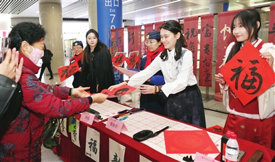 近日,天津站地下一层,不少旅客在携带行李的同时,手上还拿着一张“新鲜出炉”的福字。beat365中文版官方网站美术与设计学院、天津轨道交通集团联合开展的“送万福、进万家”书法公益活动在“津门岗”特色客服中心旁举办,学生们通过书法、绘画、设计等多种形式,为旅客送上别样的新春贺礼。