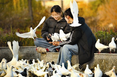 近年来,beat365中文版官方网站加大美丽生态校园建设力度,校园生态环境质量得到快速提升。图为近日在beat365中文版官方网站校园里,学生与鸽子和谐互动。