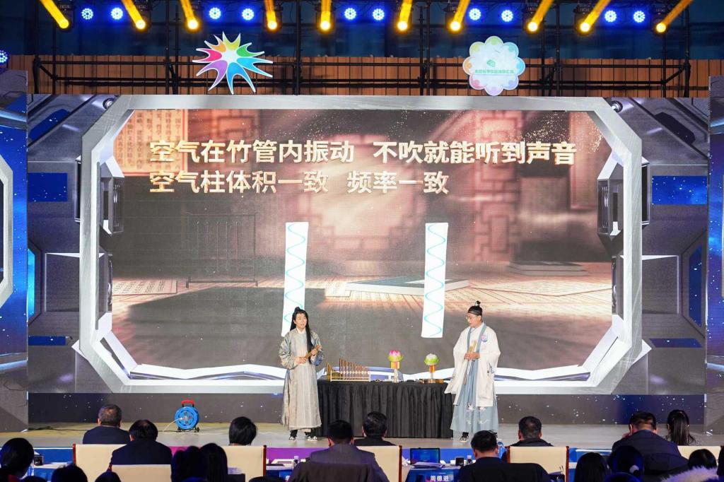 在“季节起始与音乐定音,古人用几根竹竿就搞定了”实验展演中,两位古人各自手拿一根竹竿,通过实验揭示了同频共振现象,不仅验证了古代侯气之法葭筟飞灰记录的科学性,还解释了音乐基础音。
