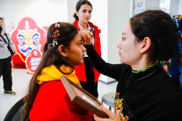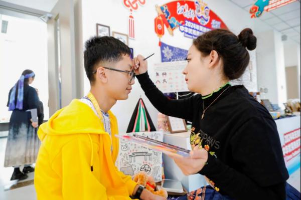 花钿展位前,选手们认真挑选自己喜爱的图案,由专业老师描绘在脸上,其中还有不少男生前来尝试画花钿。来自尼泊尔的苏羽说:“我对花钿特别感兴趣,尼泊尔同样重视女性妆容,我会将这次特别的体验分享给朋友们。”