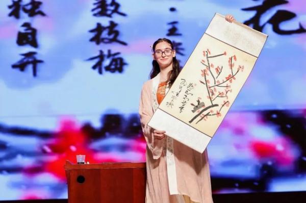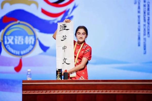 赛场上,选手们的才艺动静结合,相得益彰。来自毛里求斯的蒋丽娜现场展示了书法技艺,她静静地坐在桌前,用毛笔写下隶书“逐梦中文”,以此表达她对中文的热爱。蒋丽娜说:“我觉得汉字很漂亮,所以很想写好书法。这是我第一次来中国,非常期待能够了解到更多中国文化。”