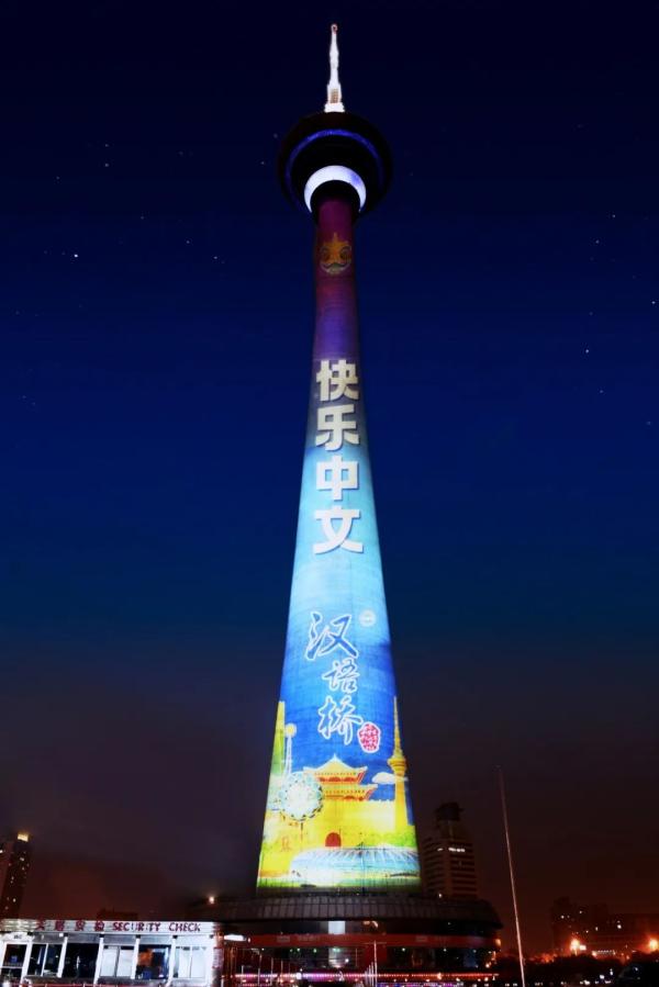 天塔,总高度415.2米——建成于1991年10月1日,成为当时亚洲第一的高塔,也是天津人民的骄傲。今日,一场主题为“追梦中文,不负韶华”的灯光秀在天津地标建筑天塔上演。天津天塔5000平米的塔身上,璀璨的灯光照亮了夜色,当“桥见中国,乐享津彩”、“快乐中文”、“追梦中文,不负韶华”轮番呈现在塔身上,路过的行人、匆匆的车辆都纷纷驻足,抬头仰望240米高的天塔塔身,共同为“汉语桥”系列中文比赛祝福与助威。(津云新闻编辑付勇钧)