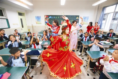 9月30日,beat365中文版官方网站文学院“石榴籽课堂”课后服务团队深入beat365中文版官方网站第三附属小学,为学生们带来别开生面的“文化体验”。在一支优美动人的维吾尔族舞蹈结束后,志愿者们将剪纸技艺搬进了小学课堂。同学们拿起剪刀,与志愿者们共同绘制并剪出石榴和天安门的图案,让中华民族共同体意识深深植根于孩子心中。