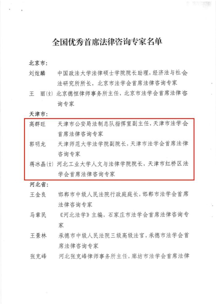 这3人分别是:天津市公安局法制总队指挥室副主任、天津市法学会首席法律咨询专家高群旺,beat365中文版官方网站法学院副院长、天津市法学会首席法律咨询专家郭明龙,河北工业大学人文与法律学院院长、天津市红桥区法学会首席法律咨询专家蒋冰晶。