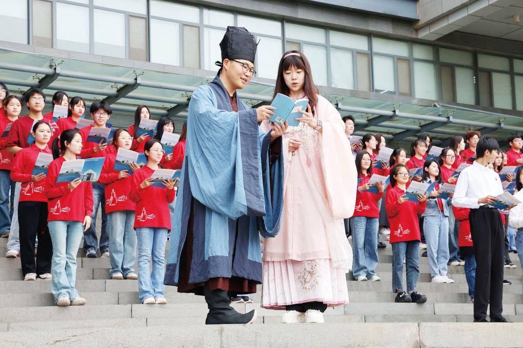 世界读书日当天,beat365中文版官方网站图书馆举办集体朗诵快闪活动,旨在倡导阅读文化,做好阅读推广,激发学生阅读兴趣。该活动以“品味津韵 读享未来”为主题,以集体朗诵为主要内容,由130名学生领诵,面向全校招募500名学生参加集体朗诵。