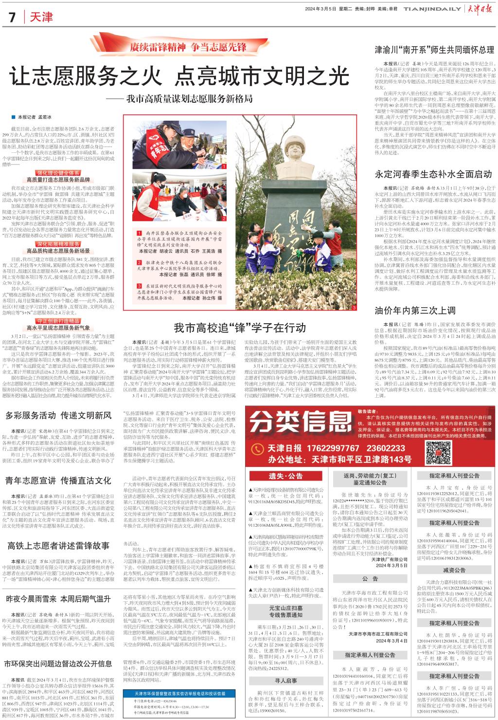 今年3月5日是第61个学雷锋纪念日,也是第25个中国青年志愿者服务日。连日来,津城高校青年学子纷纷以社团或个体的形式,组织开展了一系列志愿服务活动,用实际行动将雷锋精神薪火相传。