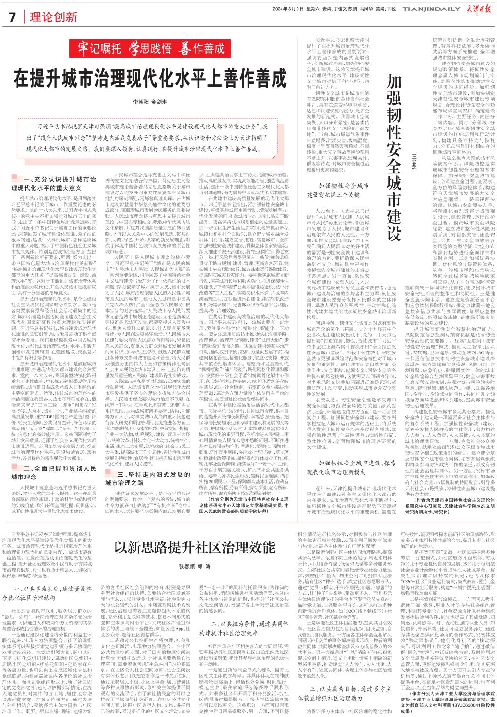 习近平总书记视察天津时强调“提高城市治理现代化水平是建设现代化大都市的重大任务”,提出了“践行人民城市理念”“坚持走内涵式发展路子”等重要要求,从认识论和方法论上为天津指明了现代化大都市的发展之路。我们要深入领会、认真践行,在提升城市治理现代化水平上善作善成。