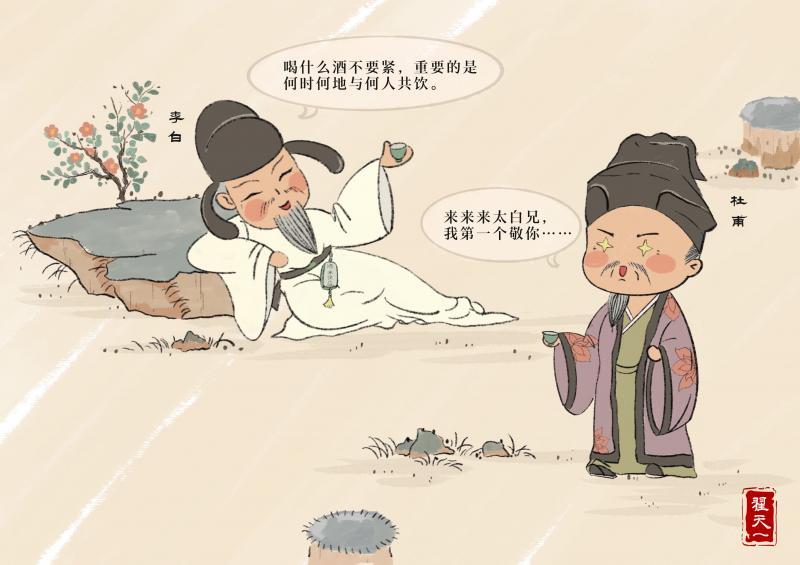 杜甫也迫不及待地要与诗仙碰杯:“来来来太白兄,我第一个敬你……”
