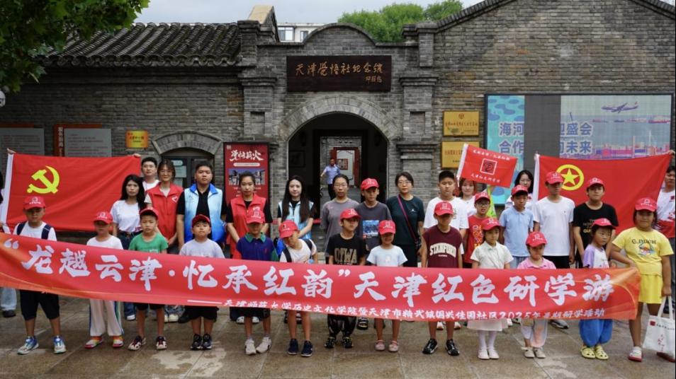 历史文化学院“龙越云津 忆承红韵”实践团联合西青区精武镇国兴佳园社区,于7月29日和7月31日分别开展两期红色研学活动。29日,实践团带领社区青少年先后走进天津梁启超纪念馆与觉悟社纪念馆,在泛黄史料与复原场景中,感受梁启超先生的爱国情怀与“少年中国说”的内涵,聆听周恩来、邓颖超等先辈的奋斗故事,体悟“觉悟”精神与“五四运动”历史意义,仿佛穿越至百年前的觉醒年代,触摸革命先驱的理想之光。31日,实践团带领社区青少年回顾研学行程、再现历史场景,组织青少年展示红色主题手抄报,分享创作思路与收获;通过红色主题益智拼图体验、合唱《歌唱祖国》等活动,深化研学感悟。学员们表示将以红色精神为动力,青春向党、奋斗不息。