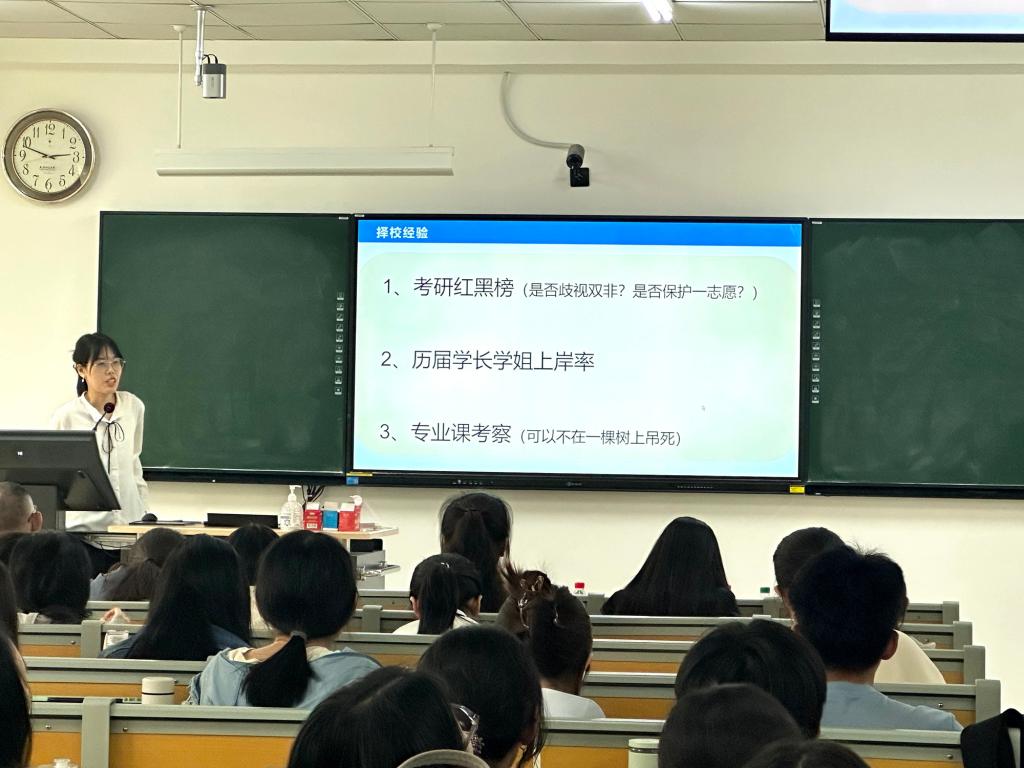 在经验交流环节,三位成功考取研究生的优秀学生代表带来精彩分享。考取湖南大学的贺罗姿讲解了如何高效地安排时间和调整心态。考取天津大学的鲁欣然着重介绍了备考方法和答题技巧。考取中山大学的余亦淇聚焦“差异化备考策略”,针对不同类型院校考核特点提出定制化解决方案。