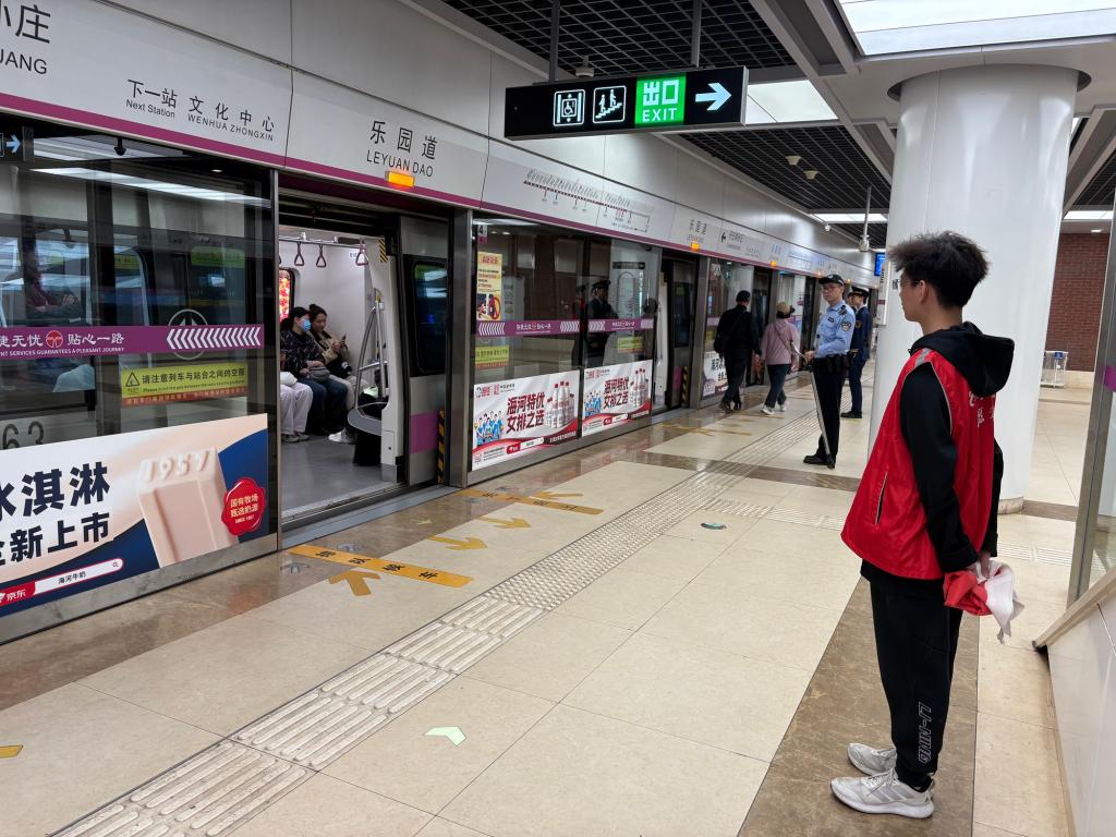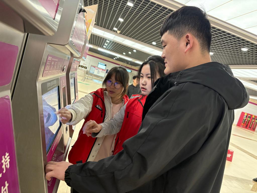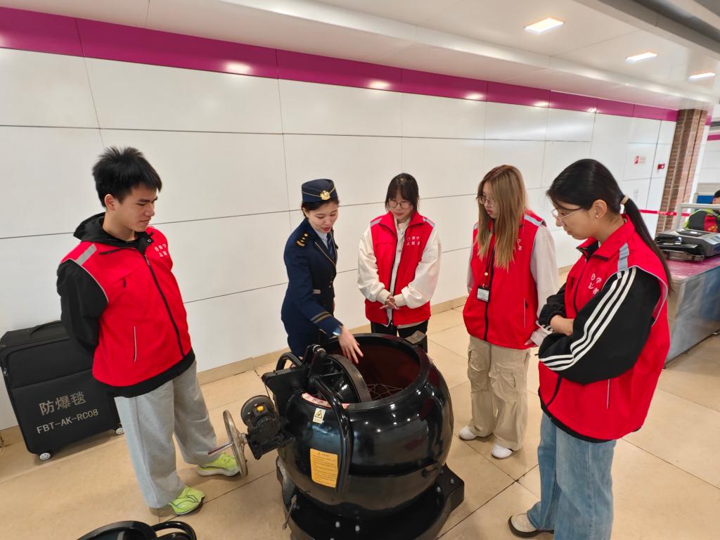 参观学习之后,同学们展开志愿服务工作,耐心引导乘客有序购票、安检、排队候车等,维护了高峰期站内秩序,彰显了青年担当。