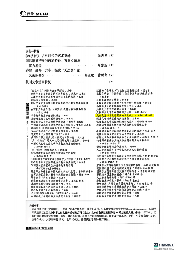 此次摘编是继2024年第3期文章《论古籍整理追求旨趣的七个纬度》(作者:王世伟)获《新华文摘》2024年第14期转载及2024年第5期文章《历史上的古籍保护意识与措施》(作者:杜泽逊,特约编辑:周余姣 责任编辑:联谊)获《新华文摘》2025年第2期全文转载,并荣登当期封面目录后,在一年内第三次被《新华文摘》转载。