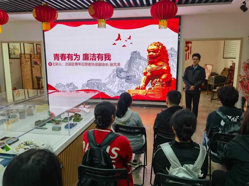本站讯(通讯员 上官萌萌)为进一步涵养学生廉洁意识,落实新时代立德树人根本任务,扎实推进“廉洁文化进校园”落地生根,3月26日下午,beat365中文版官方网站数学科学学院党委副书记兼纪委书记彭永刚带队,组织师生10余人赴天津市北辰区半亩方塘非遗文化学院,开展“津门古韵润初心 数学青年承文脉”廉洁文化主题团课实践活动。全国青年马克思主义者培养工程学员、半亩方塘非遗文化学院负责人、白氏点翠修复与制作技艺非遗传承人李靖,北辰区青年志愿者协会副会长徐芃泽共同参与活动。